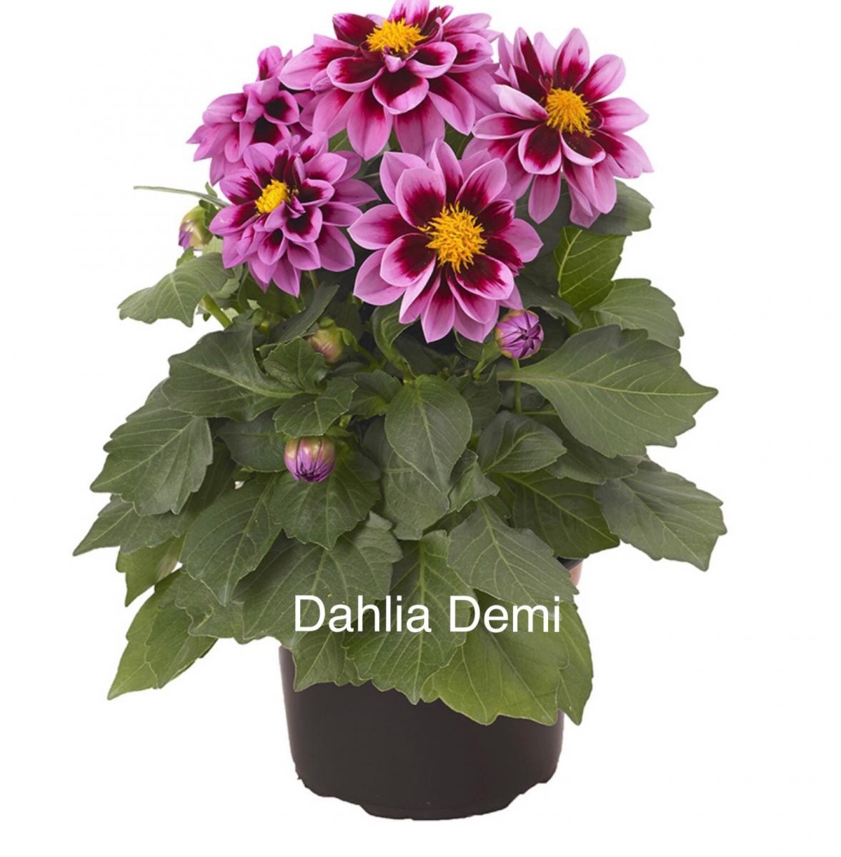 Dahlia (pot) Dahlietta Demi Excellent for patio containers, garden borders or indoor pots. The most uniform Dahlia on the market. Height 20-25cm 1 litre pot - £4.50 Prices £4.50 each (1.5 Litre pot)