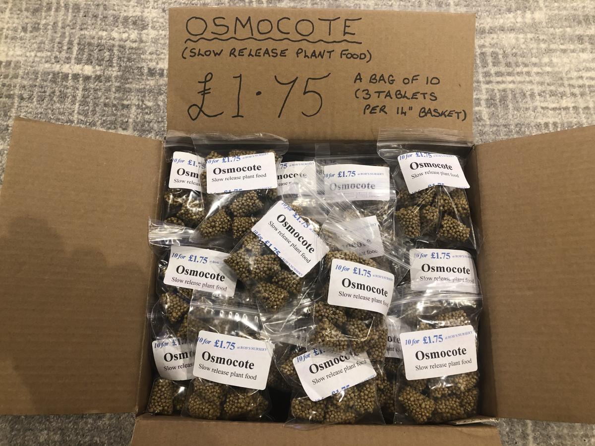 Plant Food (slow release) Osmocote Slow Release Plant Food A convenient way of feeding all your summer plants. slowly releasing over 6 months. 12” basket or small pot — 1 tablet 14” basket or medium sized pot — 2 tablets 16” basket or large pot — 3 tablets Prices £1.85 bag of 10 tablets