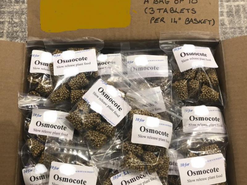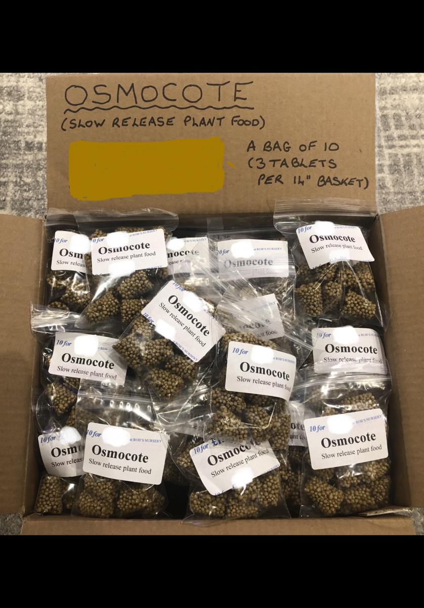 Plant Food (slow release) Osmocote Slow Release Plant Food A convenient way of feeding all your summer plants. slowly releasing over 6 months. 12” basket or small pot — 1 tablet 14” basket or medium sized pot — 2 tablets 16” basket or large pot — 3 tablets Prices £1.85 bag of 10 tablets